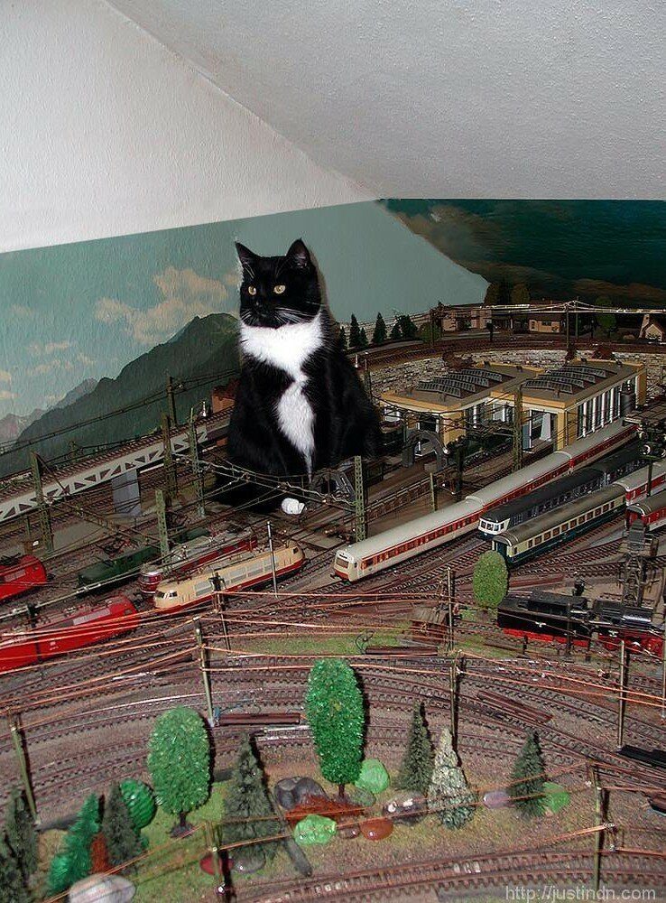 Только Дымок с белыми лапками испугался, бедняжка! Вон и язычишко высунул… А больше всего понравился котик в оранжевой жилетке «ТЧ-18» и Барсик, что так вальяжно лежит утушкой на путях игрушечной ЖД станции
