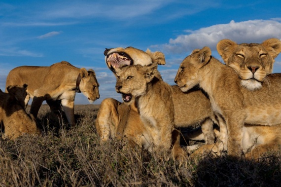 Прайд Вумби на каменистом холме у водопоя. Львы используют возвышенности в качестве пунктов наблюдения за равнинами. После дождей в саваннах вырастает трава, которая привлекает стада антилоп гну.