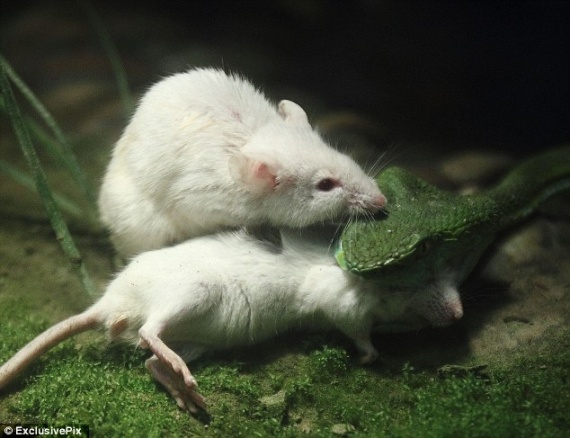 Храбрая мышь запрыгнула на голову змеи, в попытке спасти друга
