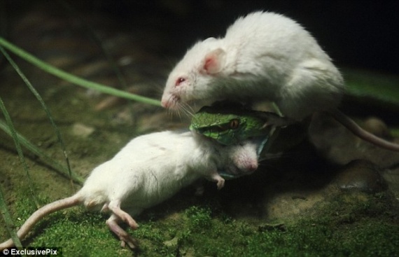 Кажется что мышь пытается лапками вытащить друга из смертельной пасти змеи