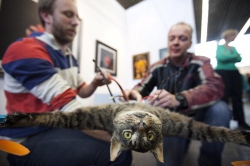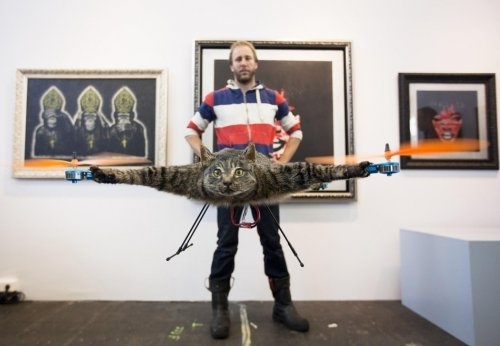 Голландский художник смастерил из своего умершего кота чучело и прикрепил к нему моторчики. Теперь кот летает по павильонам фестиваля искусств в Амстердаме, пугая окружающих и радуя своего владельца.