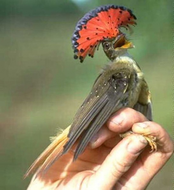 Амазонская королевская мухоловка, как вы догадываетесь, обитает только на Амазонке. Они очень небольшие и питаются летающими насекомыми. Для своего размера они строят очень большие гнезда, до двух метров в диаметре. Гнездо висит над водой, и поэтому оно труднодоступно для хищников.