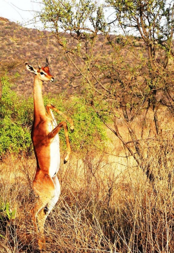 Геренук, также известен, как газель Уоллера. Это длинношеее вид антилоп, который можно встретить в Восточной Африке. Геренук с сомалийского переводится как “шея жирафа”. Геренуки имеют сравнительно небольшую голову относительно их тела, при этом их глаза и уши пропорционально очень большие. Геренуки редко пасутся, в основном они питаются акацией. Для того, чтобы достать до высоких веток, они часто встают на задние ноги.