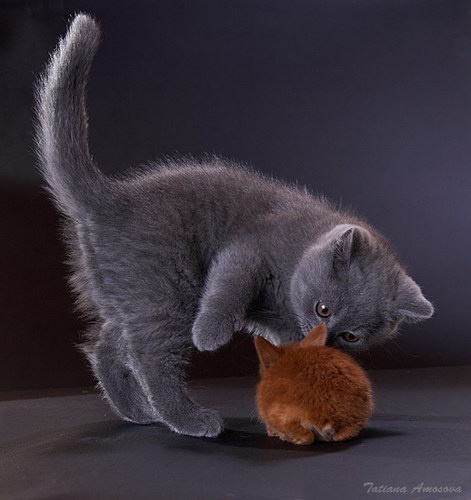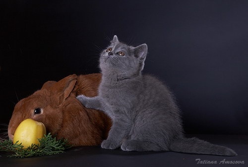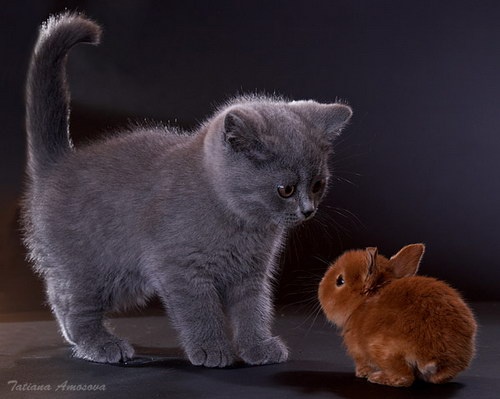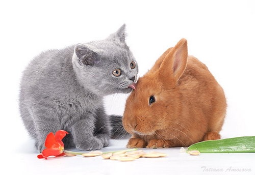 Забавные фотографии про котенка и кролика.