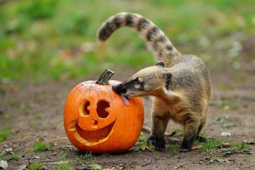 Коати (семейство енотовых) пробует на вкус Джек-Фонарь.