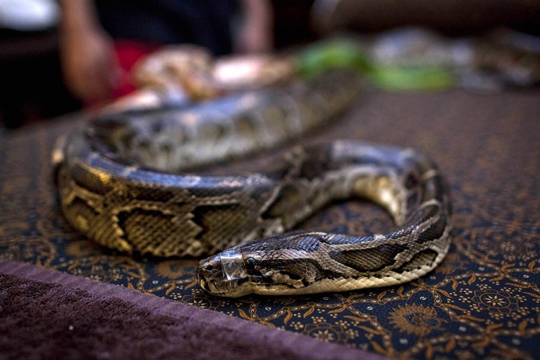 Питон в центре для животных в Джакарте, Индонезия. Питоны не ядовиты, но могут здорово укусить. Питаются главным образом млекопитающими, причем крупные питоны заглатывают даже шакалов, молодых леопардов, дикобразов, молодых кабанов.