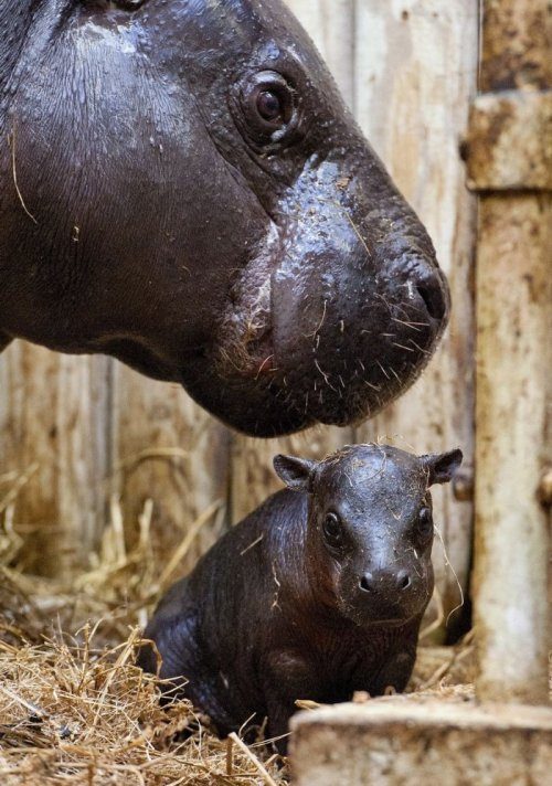 Новорождённый бегемотик со своей матерью в вольере зоопарка Таронга, Сидней, Австралия.