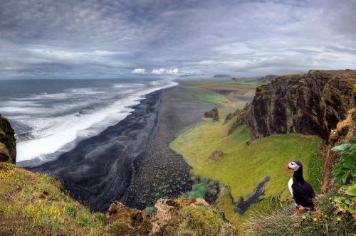 Тупик на фоне пейзажа полуострова Дюрхолэй, Исландия.