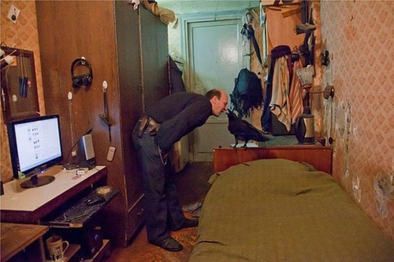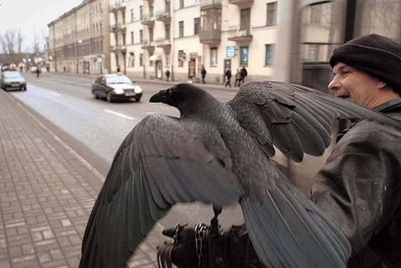 Когда Алексей оказался одиноким, одиноким оказался и Жора – трехмесячного вороненка отдали в добрые руки люди, которые начали было его выкармливать, но были вынуждены расстаться с Жорой, потому что у ребенка началась аллергия. И вот уже пять лет Алексей заботится о вороне. И тот отвечает ему редчайшей привязанностью. На вопрос, чем он кормит своего питомца, Леша отвечает с интонациями любящей матери: «Курятинку он очень любит, не сырую, а чуть отварить, и как закипит – вынуть, а главное – остудить!».