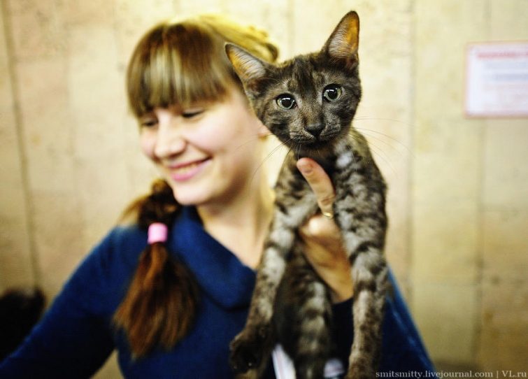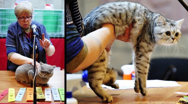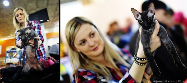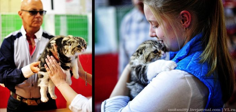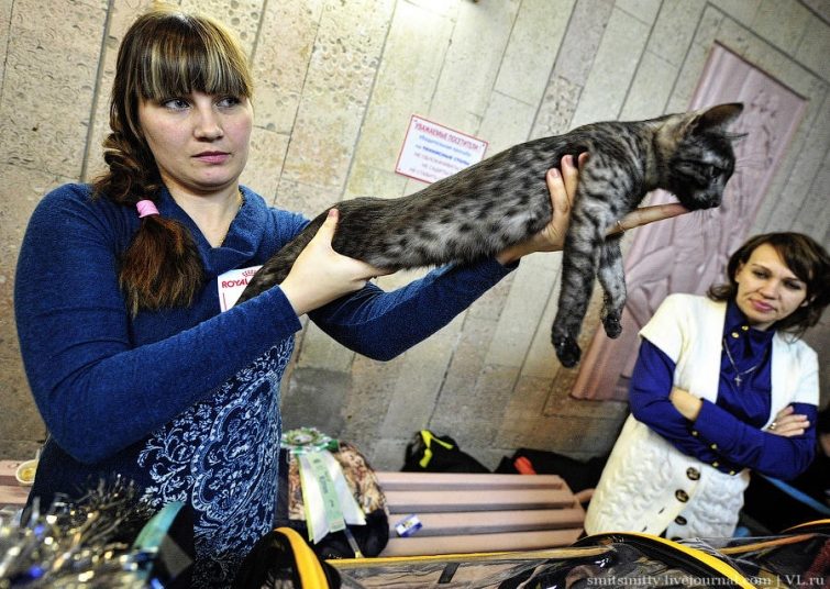 Эксперты международной ассоциации любителей кошек АССОЛЮКС Ярик Градковский из Варшавы (Польша) и Ирина Кацер из Санкт-Петербурга рассматривали каждого когтистого участника очень внимательно — оценивали цвет, размер и разрез глаз, уши, хвост, холку, шерсть, длину лап, переход от носа ко лбу и массу других параметров.