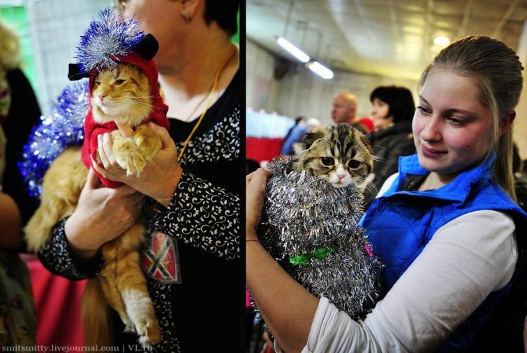 Было даже костюмированное шоу кошек — рыжий мейн-кун в костюме лошади, котенок хайленд-фолл, замаскированный под снеговика, зайка-»британец» и другие представители семейства кошачих не сильно понимали, с чего это все люди столпились вокруг и так хлопают. Зато зрителям-то радости!