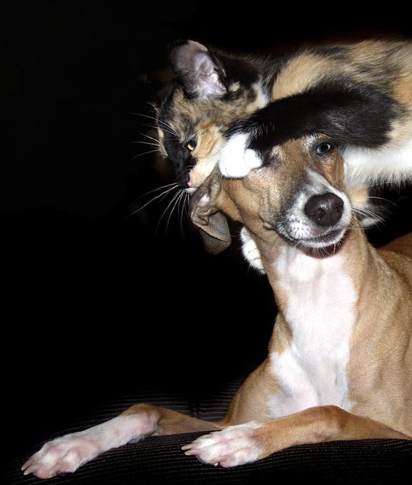 8. Эту картину трудно как-либо назвать. Кот атакует собаку в надежде на вкусное и съедобное ухо. Однако пес выглядит очень безмятежно, может он думает, что у него на голове теплая меховая шапка?!