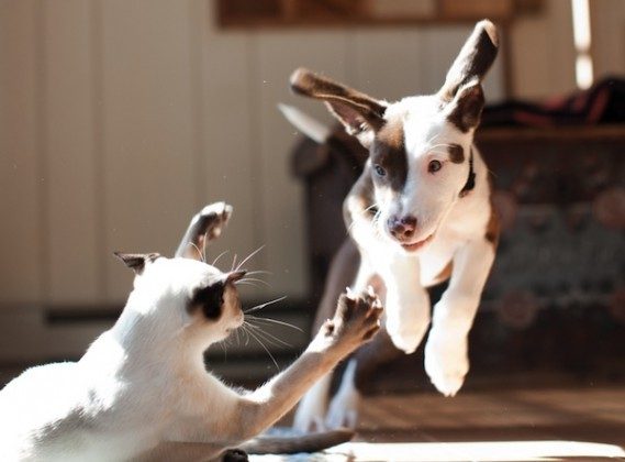 4. Здесь сиамский кот решил пойти в наступление на ничего не подозревающего щенка. Вы видите, как кот расчехлил свои когти и готов к действию, но, надо надеяться, аэродинамические уши щенка помогут ему пролететь мимо этого удара. Несмотря на то, что кошки — это чистое домашнее животное, их когти являются носителем многих бактерий и микробов. Если кошка поцарапает вас сильно, необходимо срочно промыть рану и помазать её средством от инфекции.