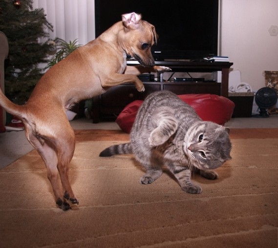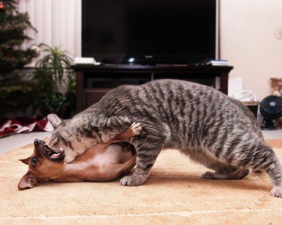 3. Вот эти два домашних питомца точно не уживаются вместе. По этой фотографии не совсем понятно, кто преобладает в доме. Собака, кажется, собирается оглушить кошку лапой, однако кот, похоже, не так прост – он готов отбиться и явно хочет применить какой-то хитрый прием. Неизвестно, кто возьмет верх, но что бы ни случилось, шерсть будет лететь во все стороны.