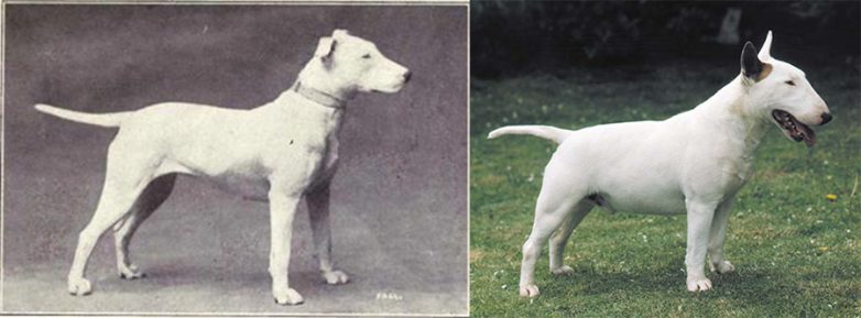 1.Бультерьер был красивой спортивной собакой. Без уродливой морды и отвислого живота. Новая форма черепа привела к появлению проблем с зубами и прогрессирующей глухоте. Кроме того у собаки врожденный вывих локтя и частые солнечные ожоги.