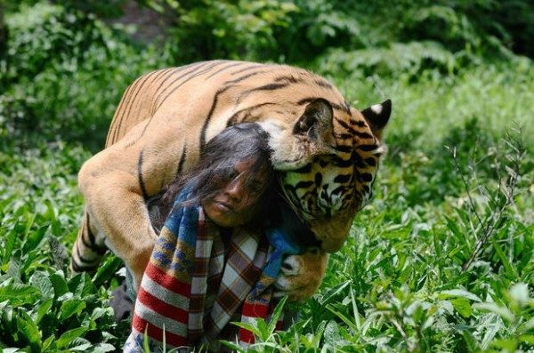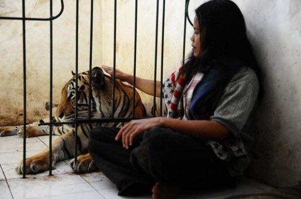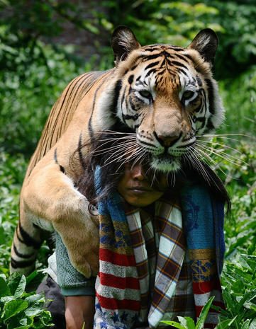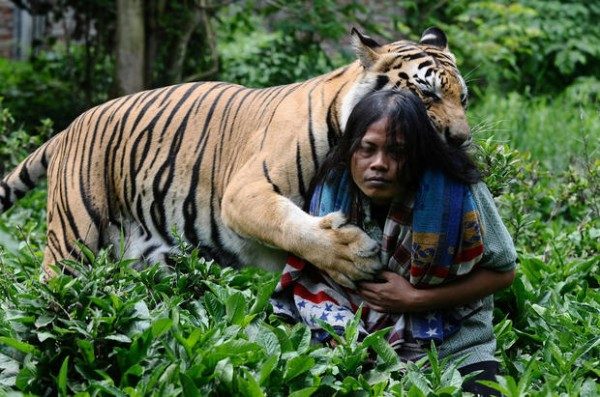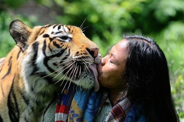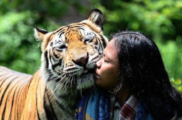 Мулан Джамиля — 6 -летний Бенгальский тигр целует смотрителя Абдуллу Шоле, 33 года, в саду рядом со своим домом в Маланге, Индонезия, 20 января 2014.