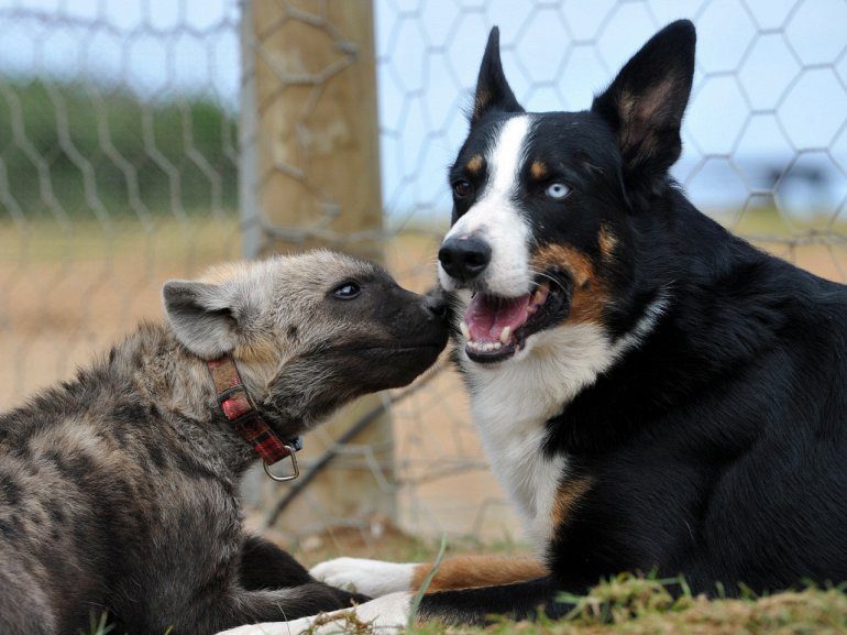 Трехцветный колли Соло заботился о молодых тиграх и гиенах в парке львов Сивью в Южной Африке.