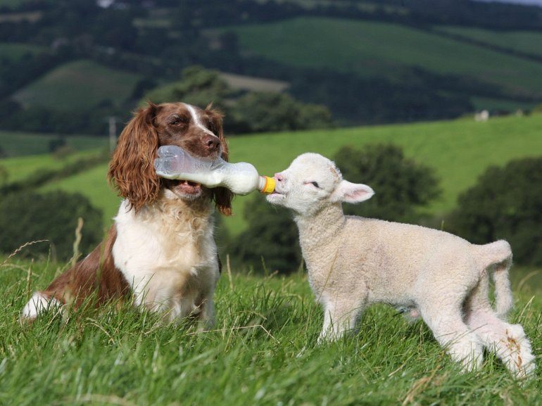 Спаниель Джесс кормит из бутылочки осиротевших ягнят, которые не могут получать молоко от своей мамы.
