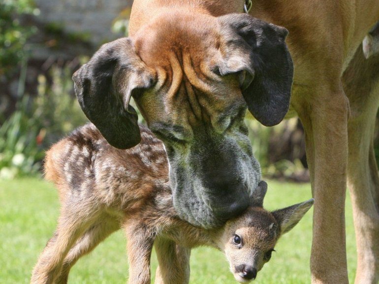 Немецкий дог по кличке Рокки очень сильно привязался к Синди, брошенной косуле, в спасательном центре дикой природы в Англии.