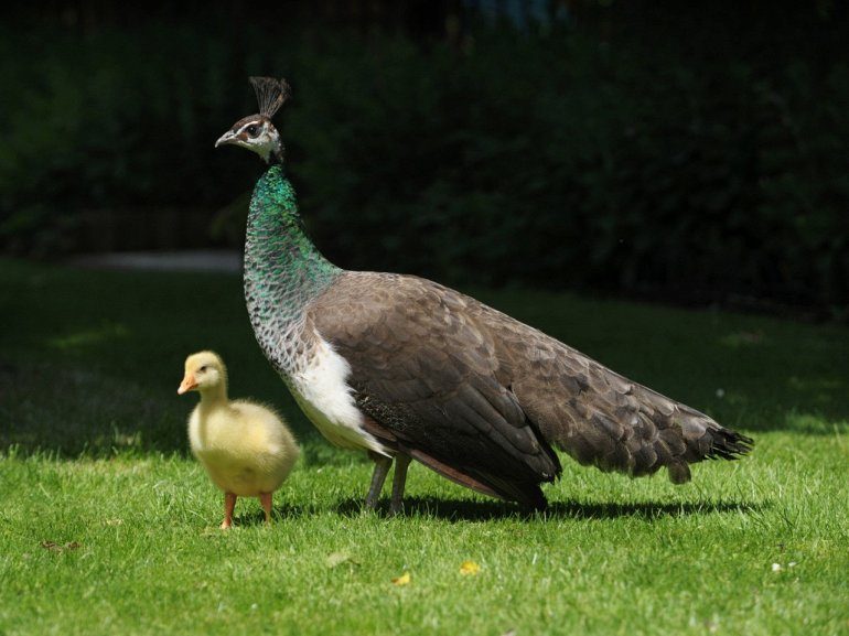 После того как самка павлина случайно перепутала яйца и высидела на яйцах гуся, она заботилась о новорожденных, как о своих собственных.