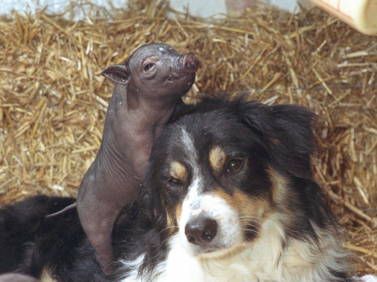 В больнице для животных колли по имени Мак решила взять под воспитание четырех вьетнамских пузатых поросят, которые были брошены их матерью.