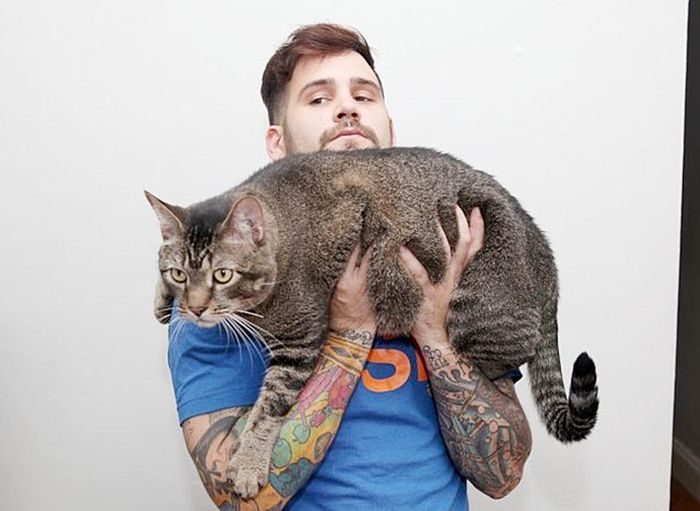 4. Совсем недавно этот гигант был обитателем бостонского приюта для животных. Когда фото кота-великана появилось в соцсетях, сразу нашлось около пяти десятков желающих стать его хозяевами. На фото: Котозавра держит один из работников приюта.