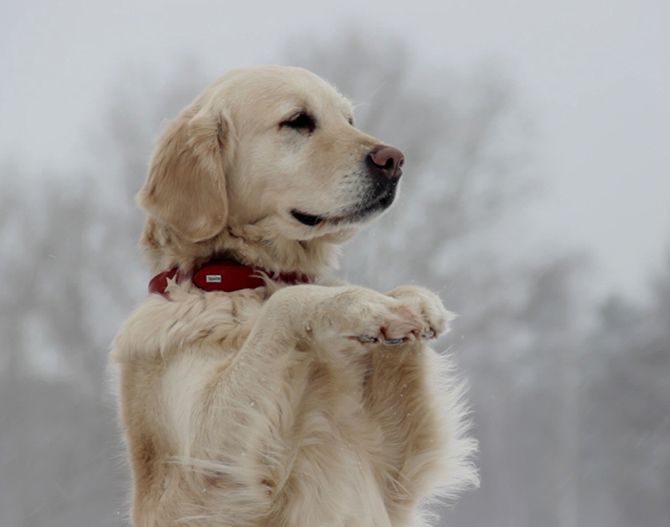 Перед тем как начать дрессировку, Артём гладит Агату, чешет её за ухом, шепчет добрые слова. В знак благодарности Агата лижет его руку. По команде «сидеть» золотистый ретривер усаживается около ног своего хозяина и сосредоточенно начинает наблюдать за ним. Иногда, наверное, для того, чтобы лучше слышать хозяина, Агата слегка приподнимает одно ухо.