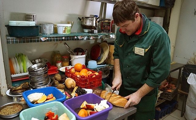На часах обед. Заведующий отделом млекопитающих идёт на кухню. Фрукты, овощи и хлеб Сергей режет на большие части.