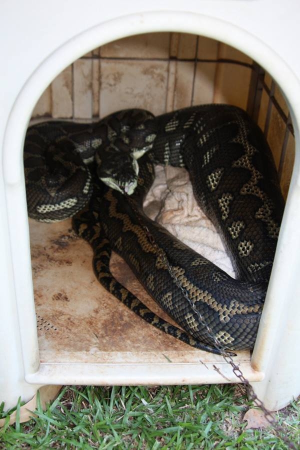 Утром, когда женщина подошла к будке, чтобы снять животное с цепи, она увидела ужасающую картину: вместо её любимицы в конуре, свернувшись клубком, лежал 2,5-метровый питон, с раздутым брюхом, а из его пасти тянулась цепь.