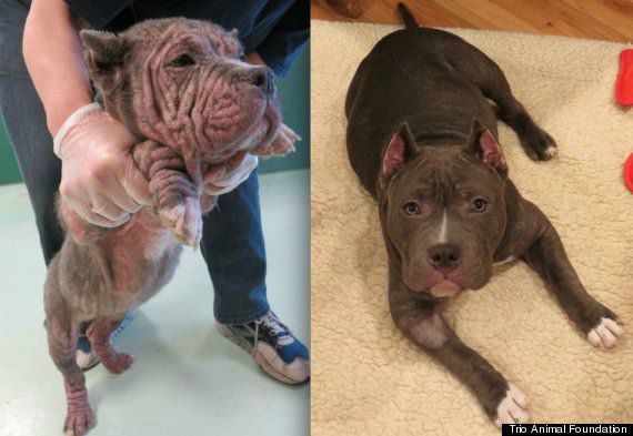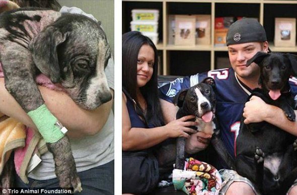 Щенок питбуля Бридди был найден, страдающим от тяжелой формы чесотки в ужасном состоянии, но после надлежащей медицинской помощи обрел новую любящую семью.