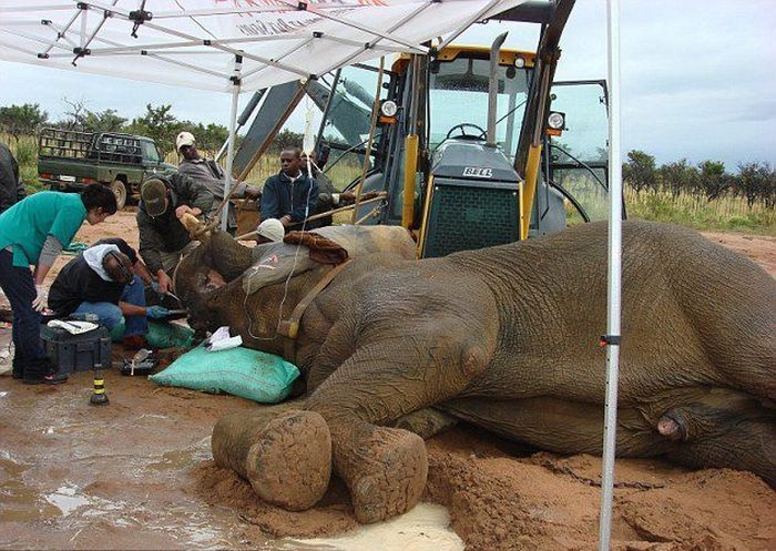 Носорогу удалил инфицированый рог. Командные усилия по переворачиванию послеоперационного носорога в рабочее положение.