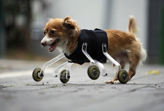 Хоппа, четырехлетняя собака смешанной породы, родившаяся без передних ног, использует протез для прогулок на свежем воздухе в Тель-Авиве. Устройство было изобретено специально для Хоппы студентом, любящим животных, который надеется, что его устройства будут способствовать улучшению жизни животных с врожденными аномалиями или ампутированными конечностями.