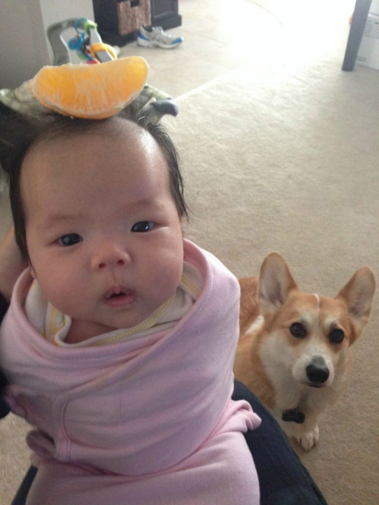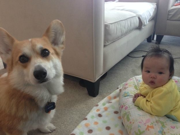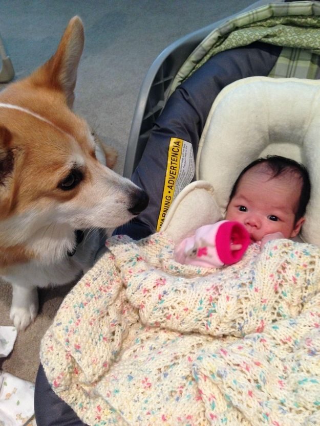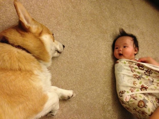 Молодой отец из США Крис Лоу выложил в социальную сеть фотографии своей дочки Клэр, мирно спящей рядом с собакой породы корги.