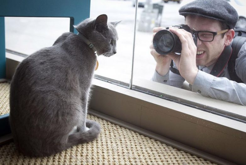 Оператор снимает кошку через окно кафе. Кошке, кажется, по барабану такое внимание.