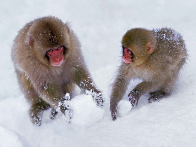Японские макаки играют в снежки для развлечения.