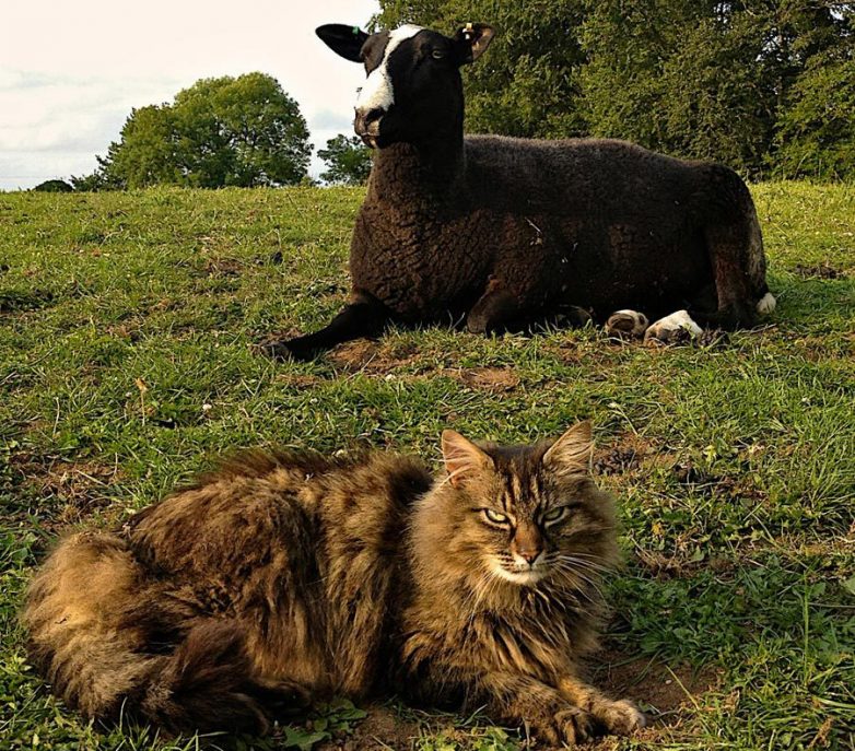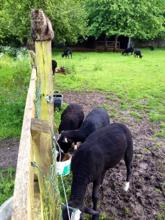 1. Вообще, овец пасут пара собак, а котяра, так сказать, генеральный директор, который смотрит, чтобы всё было в порядке и в случае необходимости дает знать Сюзанне о проблеме. Ну, например, ягненок застрял в изгороди, или еще что-то из ряда вон выходящее. В этом случае кот, который всегда сидит где-то сверху, приходит и сообщает о непорядке. Он же, например, присутствует при родах у овец, ободряя хозяйку.
