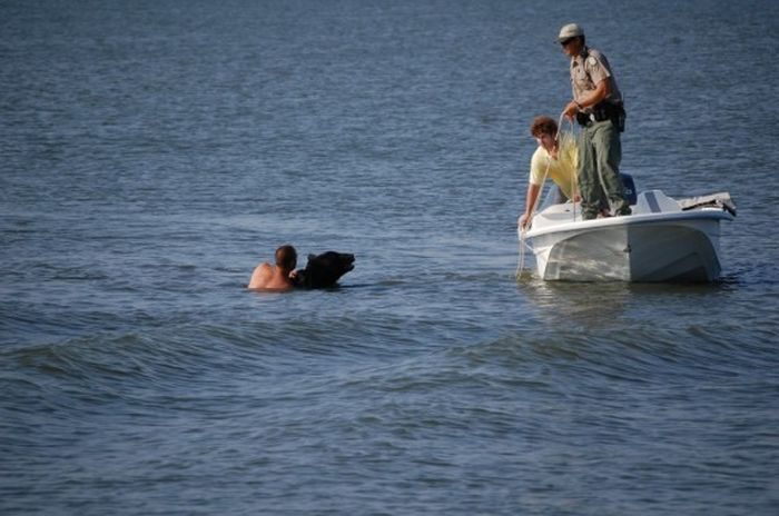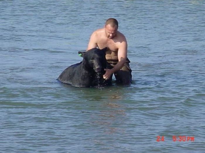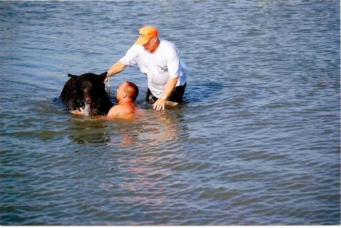 Биолог среагировал быстро, он схватил медведя за шею и держал его голову над водой