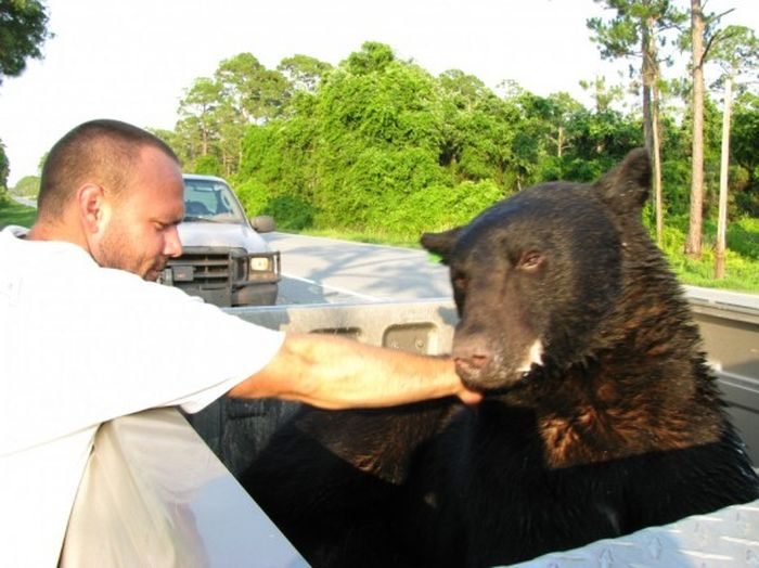 Во двор жилого дома во Флориде забрел большой черный медведь, владельцы дома не испугались и тут же вызвали полицейских, чтобы прогнать медведя подальше, но медведь уходить не хотел. Тогда было принято решение выстрелить в него дротиком с транквилизатором. После того, как дротик был в медведе, вещество стало понемногу действовать, а медведь впал в панику и побежал к океану. Где на него и подействовал транквилизатор в полной мере, вырубив медведя в воде прямо во время заплыва.