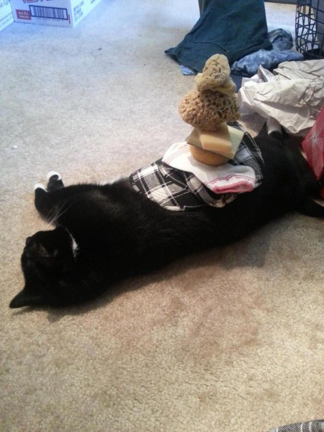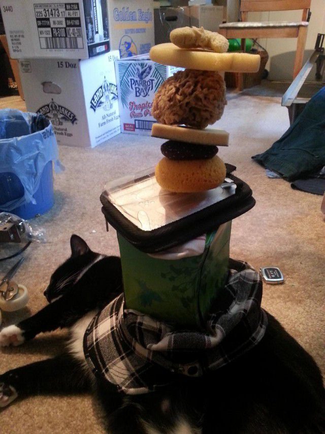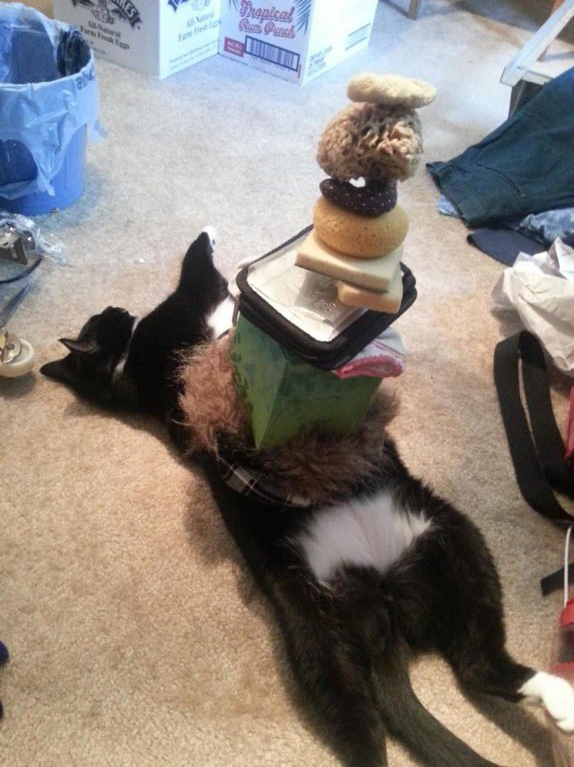 Ох, классно!!! Уникальное спокойствие! И сами вы все придурки! Хозяин добавлял объёмные, но ЛЁГКИЕ вещи, неужели вы не видите? Если б кот НЕ хотел, то сбежал бы и от носочка уже. Просто вы не знаете кошек.