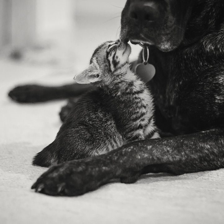 У нас уже была собака, которая сразу же влюбилась в котят.Она вела себя так, как будто котята были ее собственными.