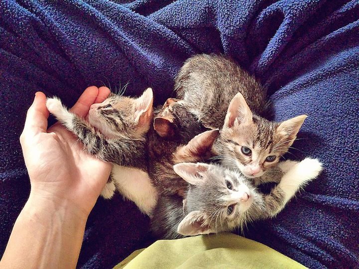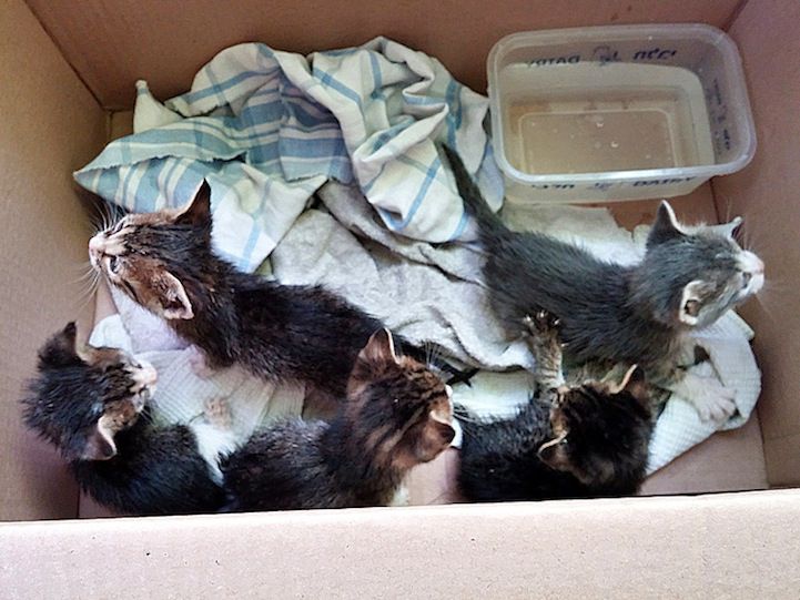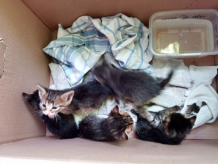 Она знала, что это не редкость для диких кошек, чтобы оставлять своих котят в безопасном место в течение нескольких часов, пока она была на охоте. Однако, поскольку это был очень жаркий день, Мария стала волновался, когда крики продолжились более часа. После поиска источника плача, она обнаружила, что кто-то оставил пять крошечных котят в картонной коробке. Они были в очень плохом состоянии — грязные, тощие, выпрашивая пищу и воду и пытались бежать из коробки.