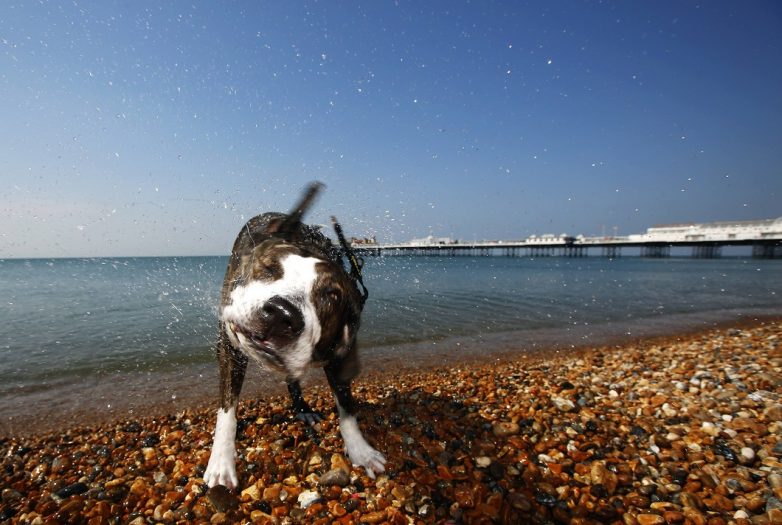 7. Стаффордширский бультерьер стряхивает воду во время жаркого летнего дня на пирсе Брайтона в Англии.