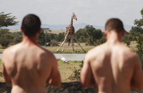 Туристы наблюдают за жирафом, пришедшим на водопой близ палаточного лагеря Свитвотерс, Кения.