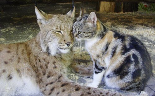 Рысь по кличке Линда со своей лучшей подругой, домашней кошкой Дусей, зоопарк Санкт-Петербурга, Россия. Их очаровательная дружба покорила всех: и работников зоопарка, и посетителей, приходящих увидеть эту «сладкую парочку».