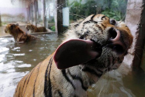 Бенгальский тигр облизывает окно своего вольера в филиппинском зоопарке.