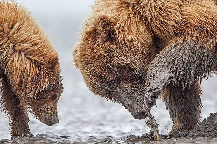 2. Медведица учит детеныша находить моллюсков. Большая часть добычи достается медвежонку.