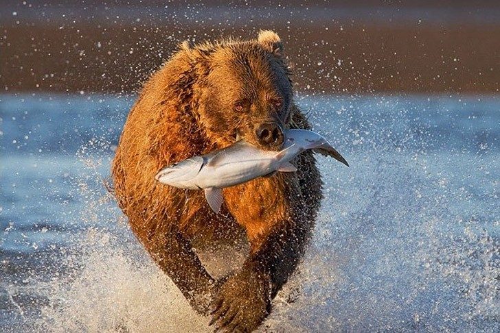 4. Началась охота на лосося: медведь преследует рыбу и боится упустить ее из виду.