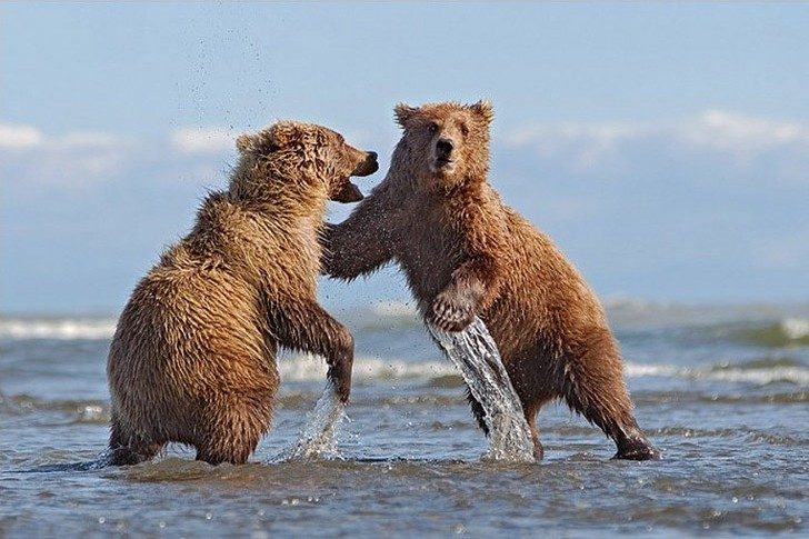 5. Два молодых медведя на мелководье решили помериться силой. Победителю достанется лучшее место для ловли рыбы на реке. Если силы равны, драка может затянуться.