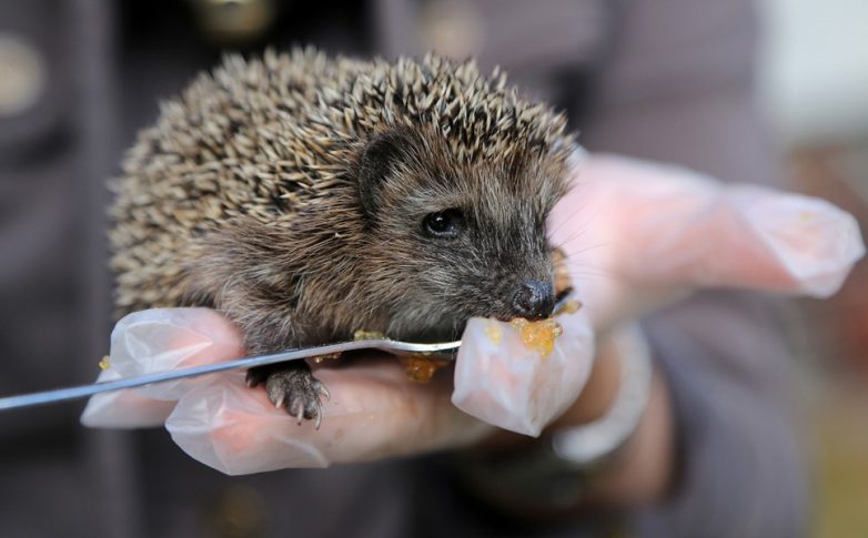 8. Маленького ежика кормят кошачьим кормом.