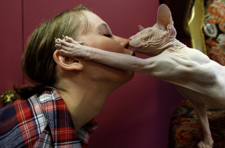 1. Сотрудница питерского арт-кафе «Кошачья Республика» целует кошку по кличке Дюшес породы донской сфинкс. В этом кафе есть выставочный зал и библиотека, где и живут кошки.